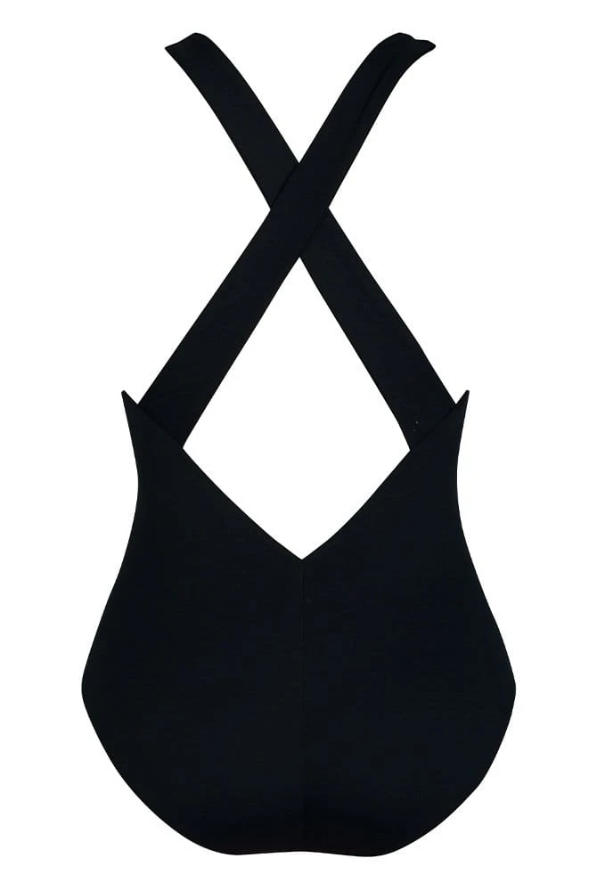 Die breiten, im Rücken über Kreuz gelegten, Träger sorgen für komfortablen Halt und sind noch dazu ein echter Blickfang. In edlem Schwarz ist der Einteiler der perfekte Begleiter für die Poolparty oder eine ausgiebige Schwimmsession.